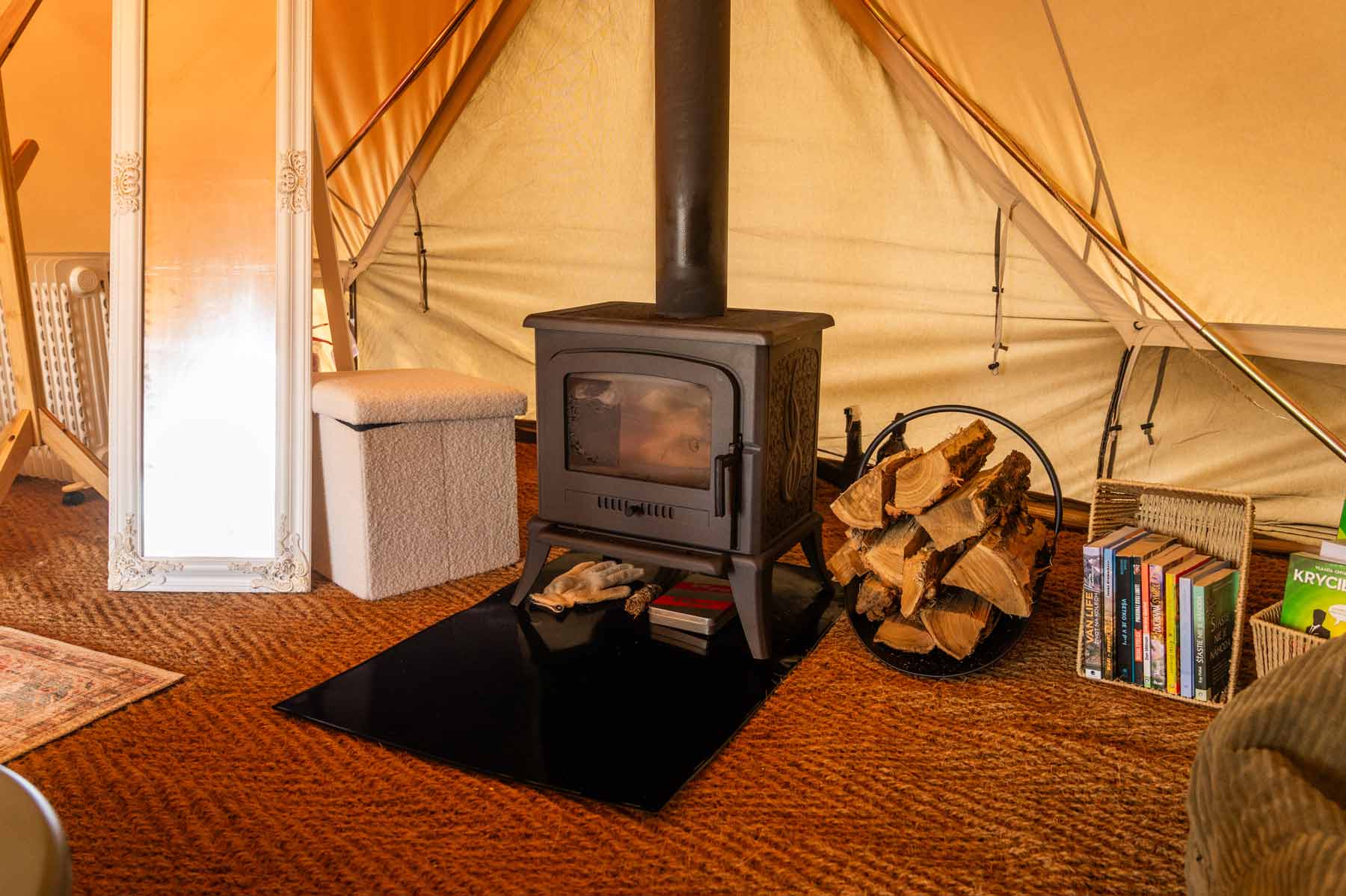 Vo vnútri je teplo a útulno — praskajúci krb s pripraveným drevom, radiátor s automatickým spínaním na udržanie príjemnej teploty počas celej noci, mäkká posteľ a komoda na osobné veci.